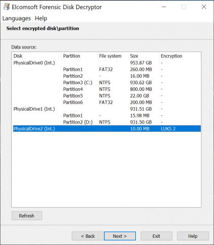 Elcomsoft Forensic Disk Decryptor LUKS2 - selecting disk